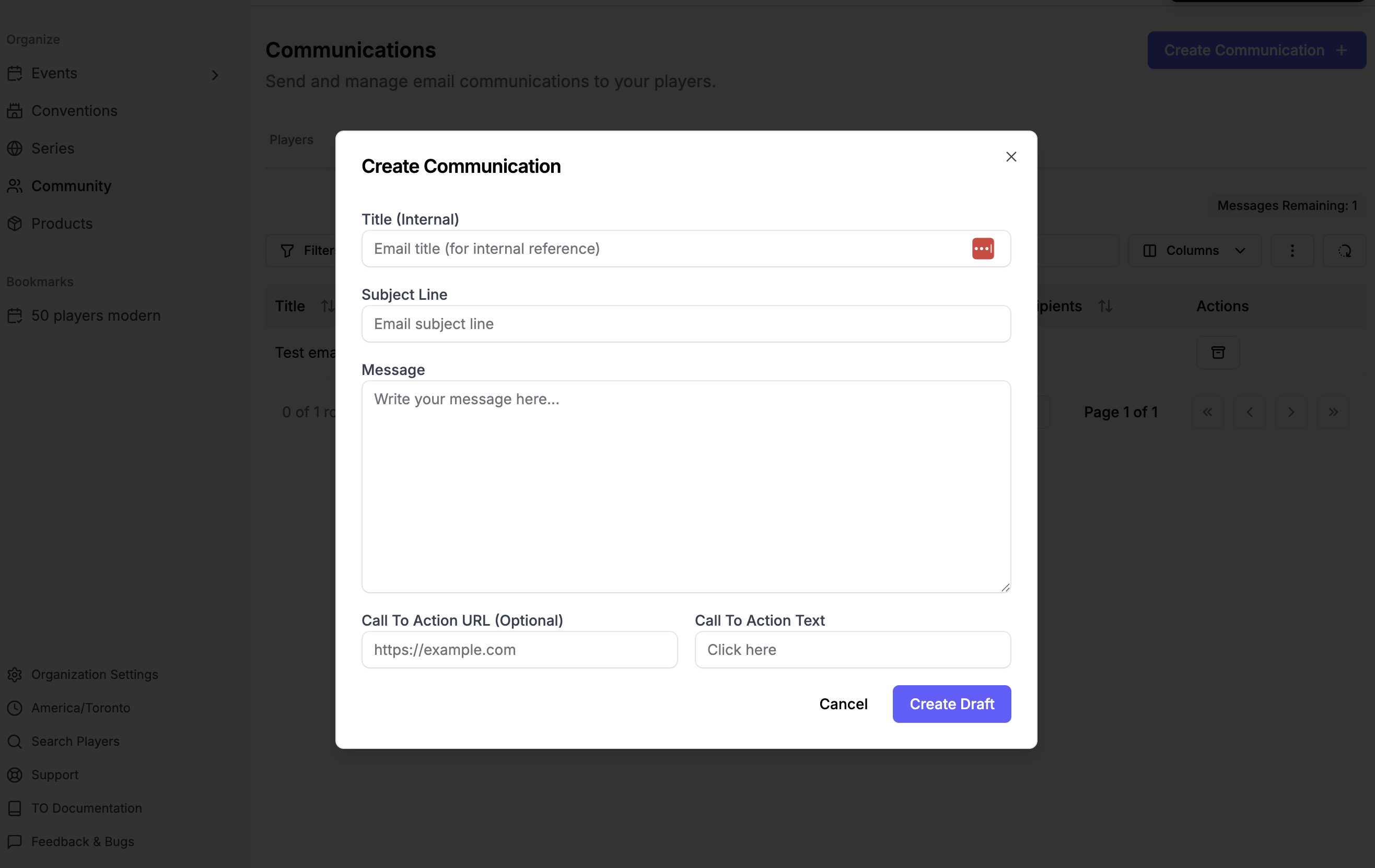 The communications system lets you send targeted emails to your players. You can create drafts, schedule messages for later, and track sent communications.