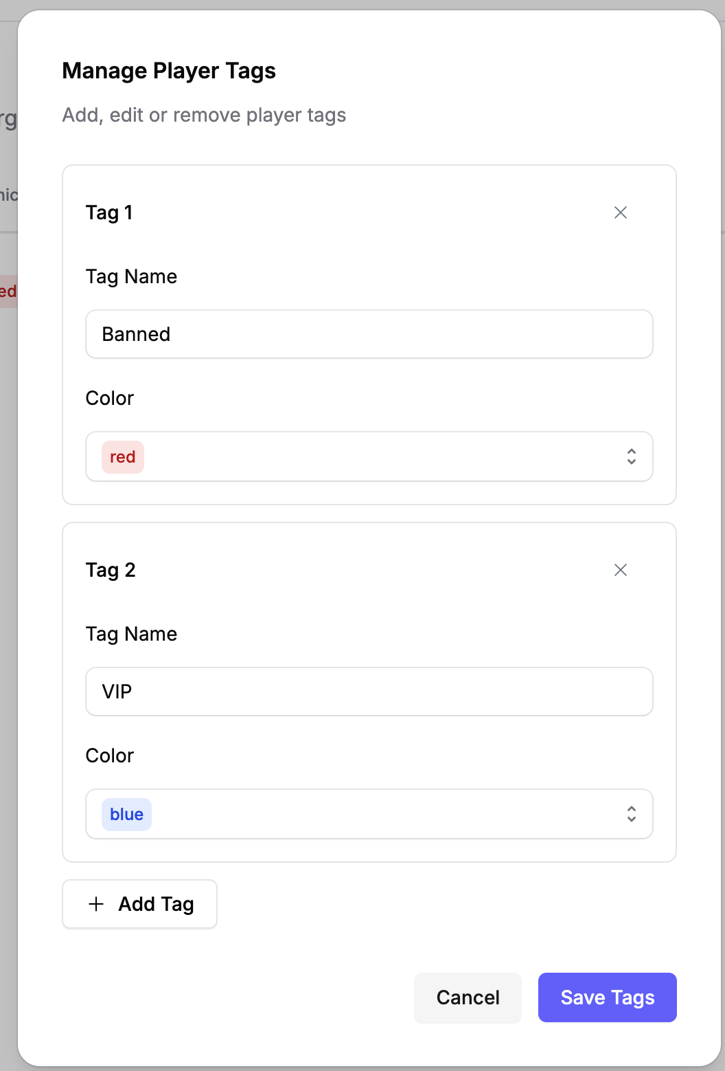 Tags help you organize and segment your players. You can create custom tags with different colors to categorize players based on any criteria you choose.