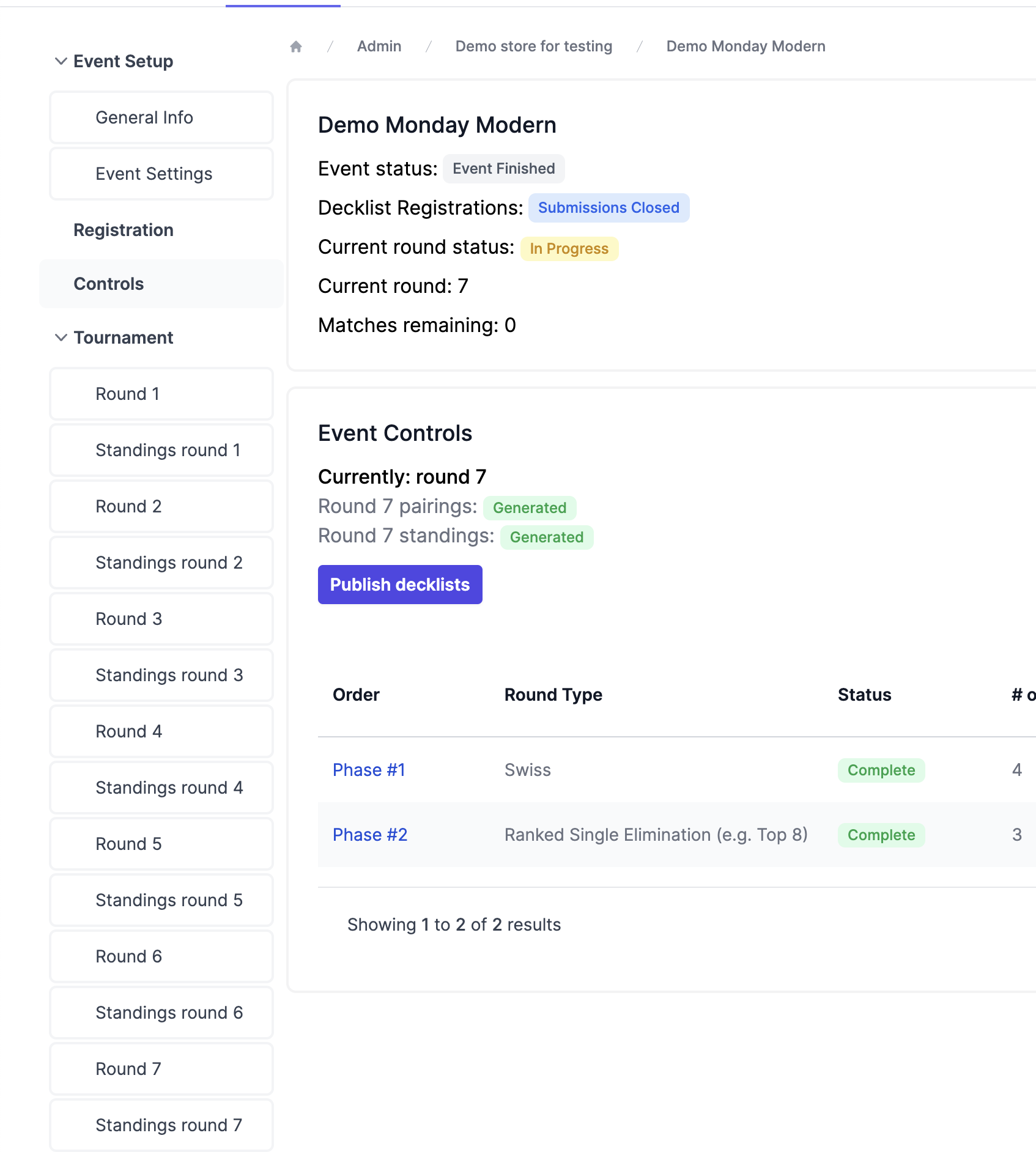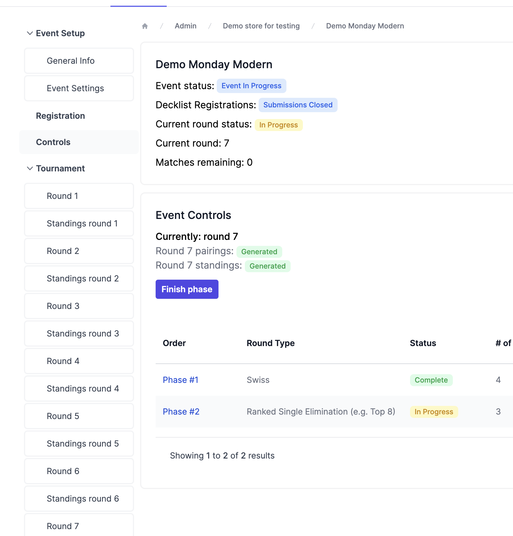 When the standings for the final round of an event are generated, you’ll be prompted to finish the phase. If there’s no additional phase afterwards, the event will finish.