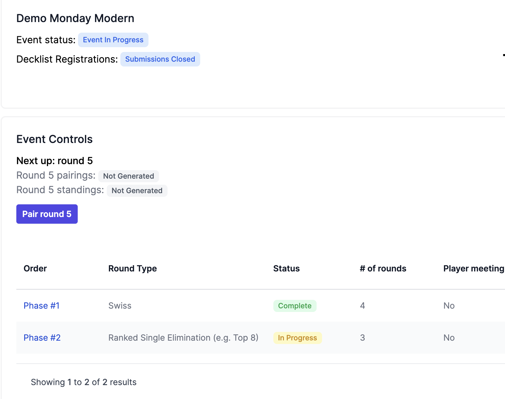 When a player loses in ranked single elimination, they are eliminated once the standings are generated for that round. You can progress through the rounds as normal until the event is finished. Once the single elim rounds have been completed, you’ll be prompted to “finish phase” which will end the event!